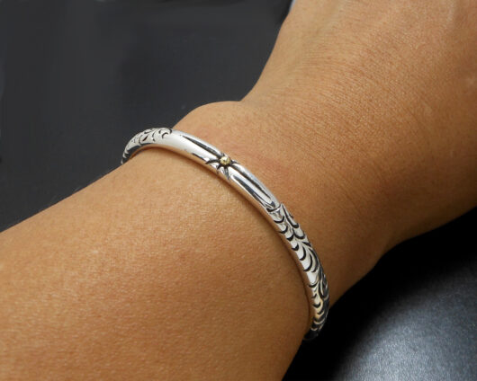 The lovely floral textured open bangle bracelet are 925 sterling silver with handmade gifts for her designed by Sup Silver.