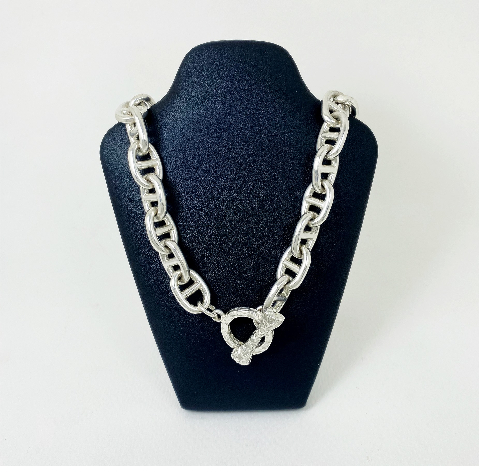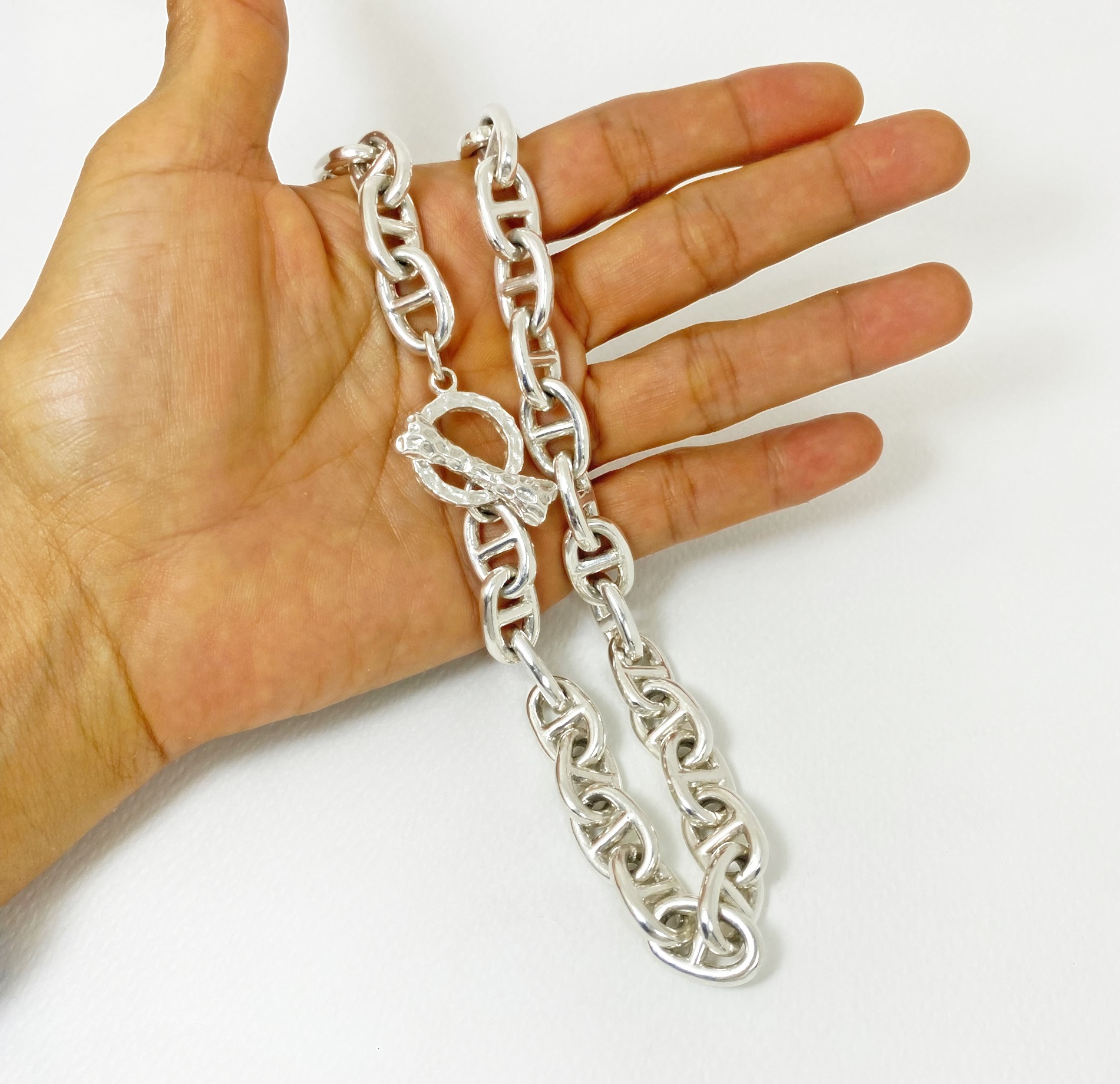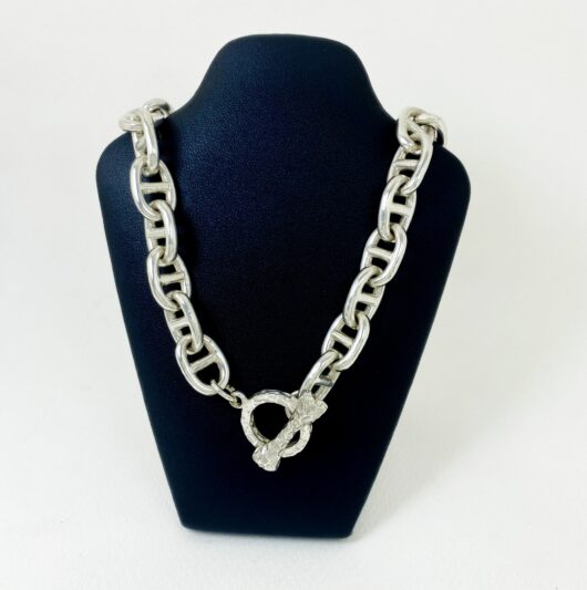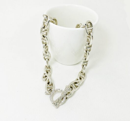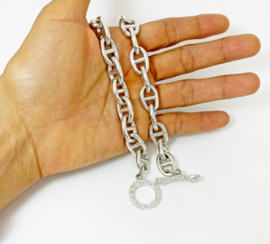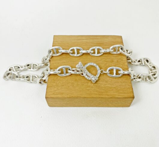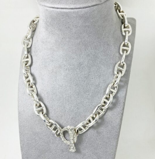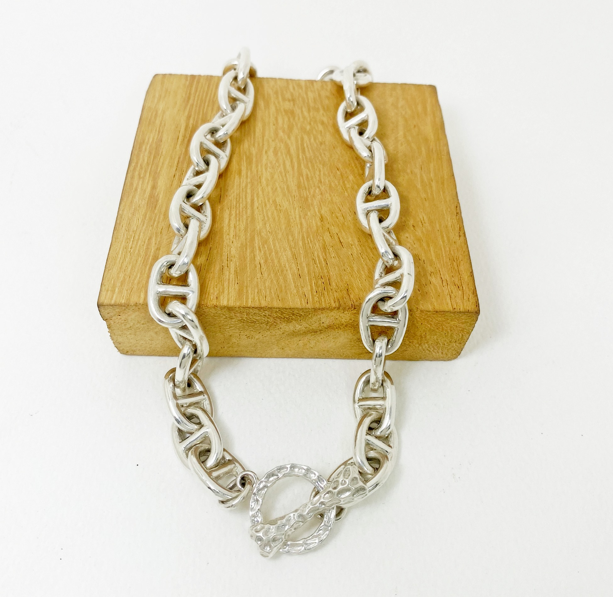 The chunky bone textured t bar figure 8 link necklace is 925 sterling silver with handmade bone toggle necklace designed and made by Sup Silver.