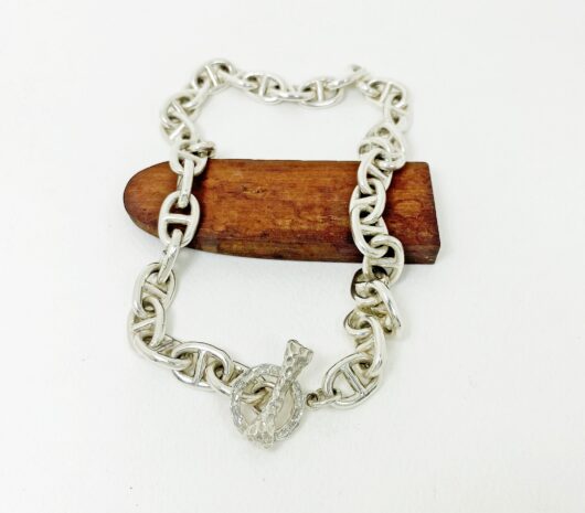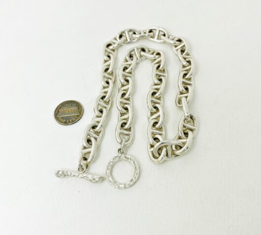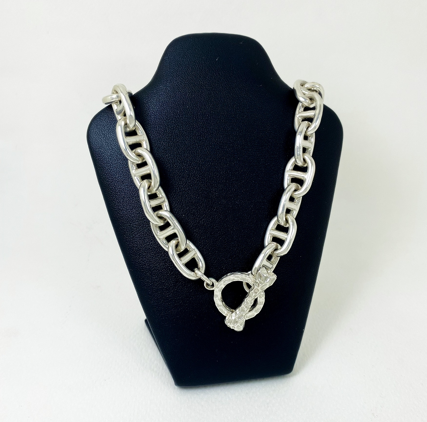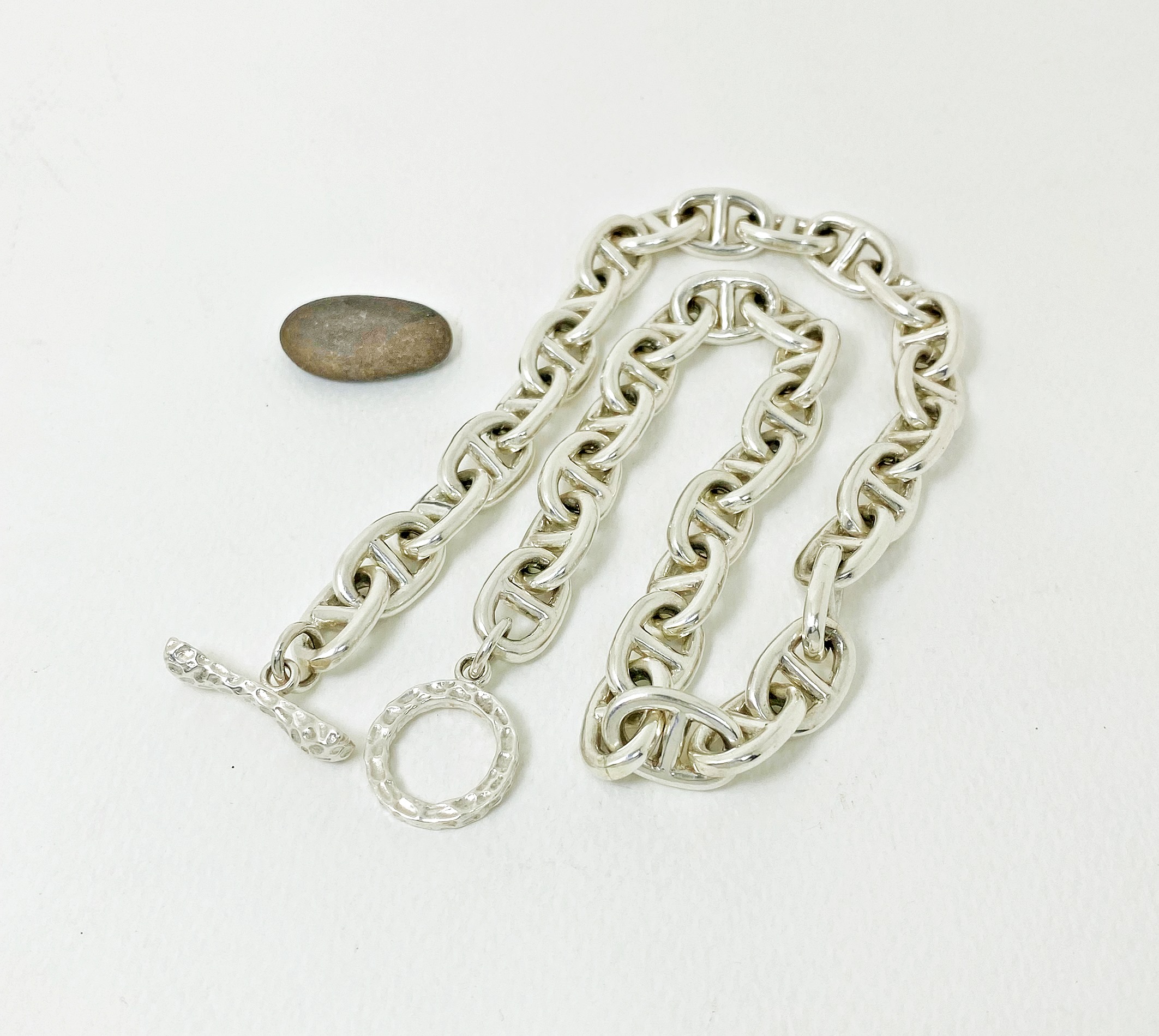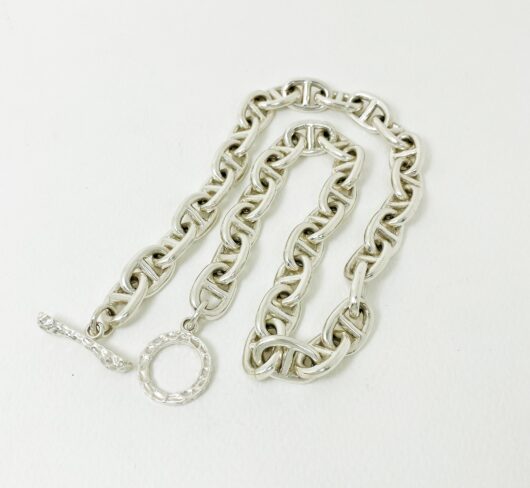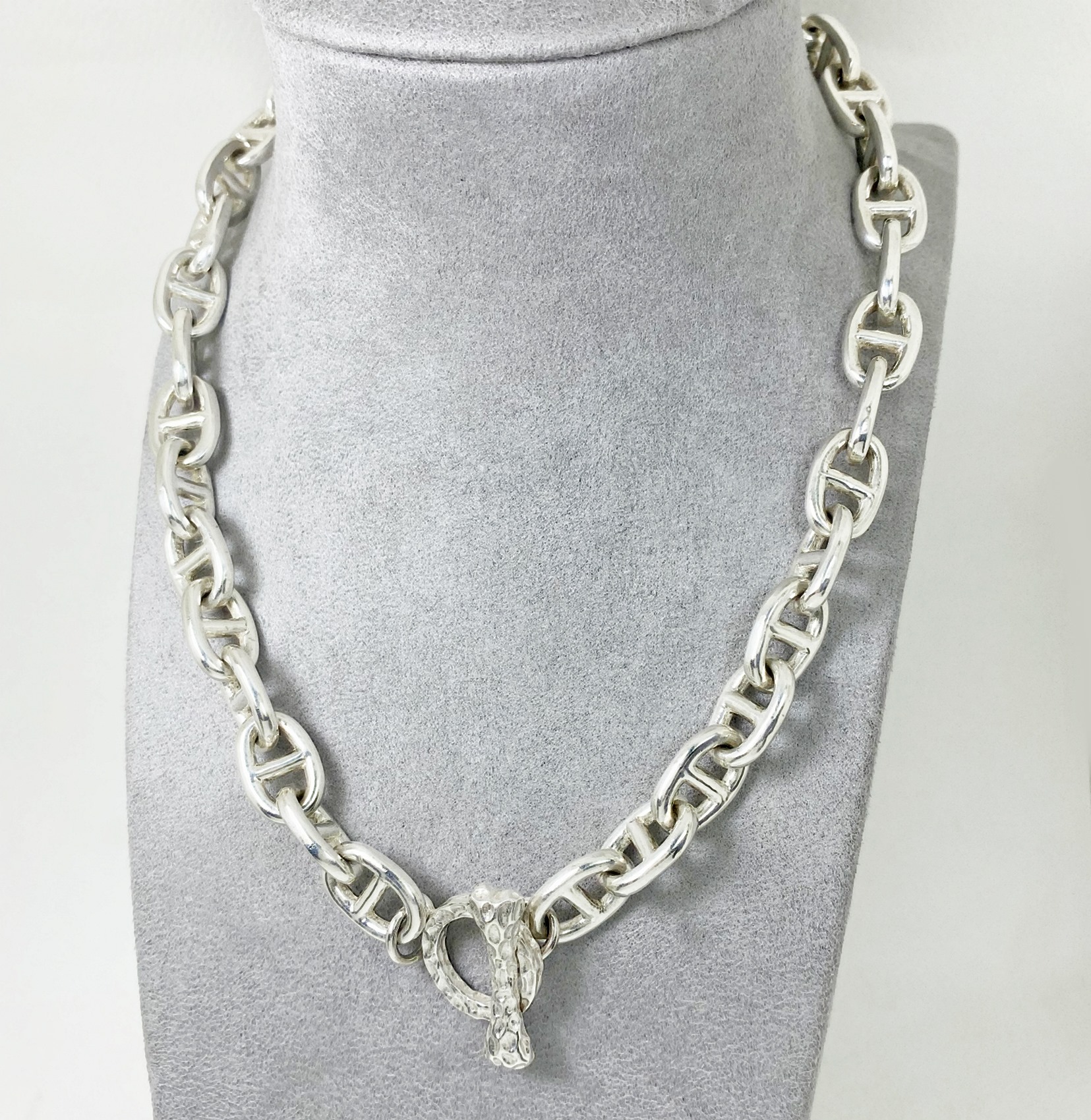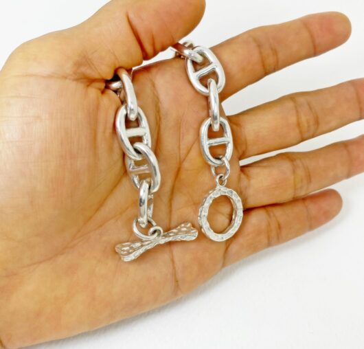 The chunky bone textured t bar figure 8 link necklace is 925 sterling silver with handmade bone toggle necklace designed and made by Sup Silver.
