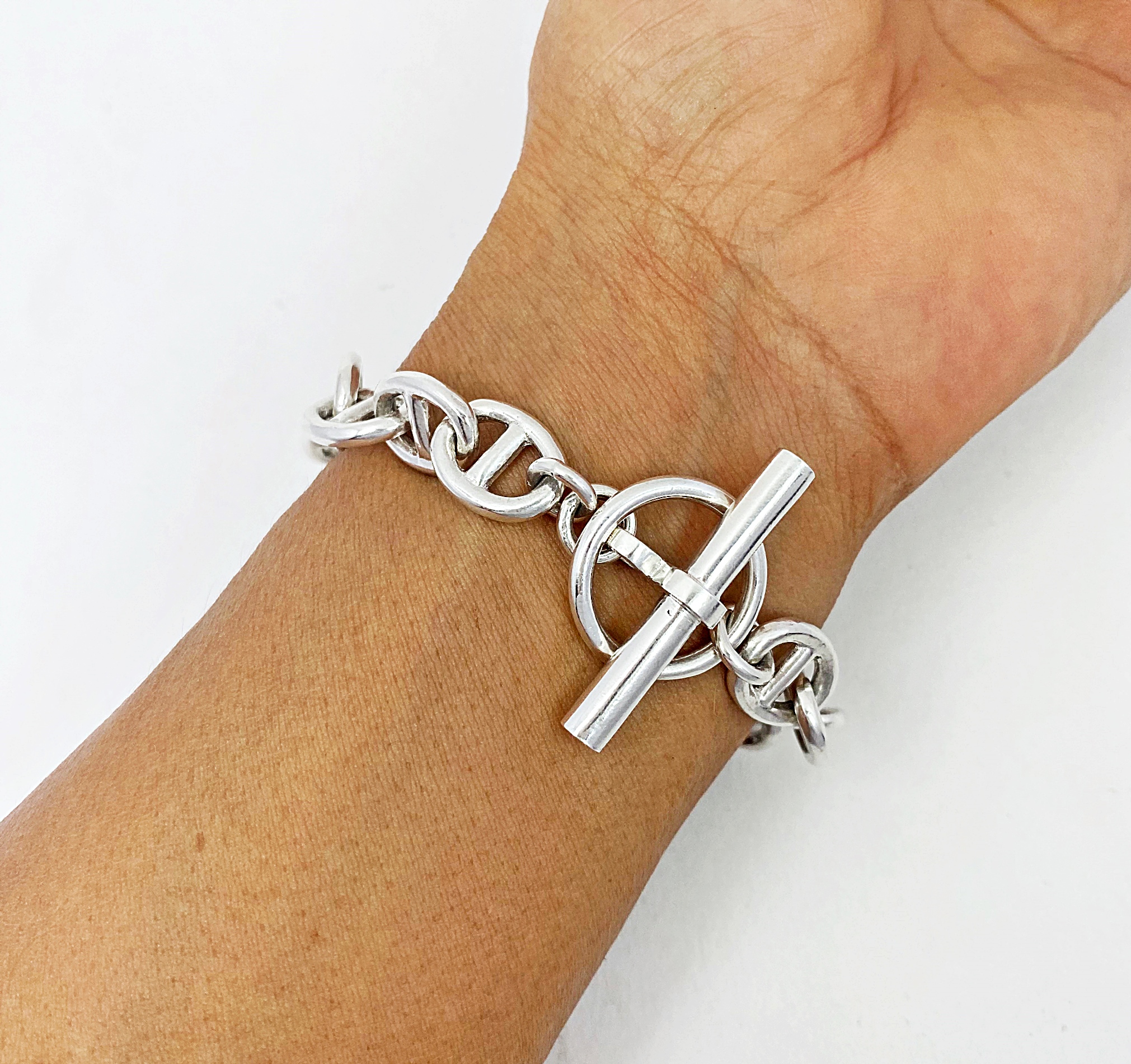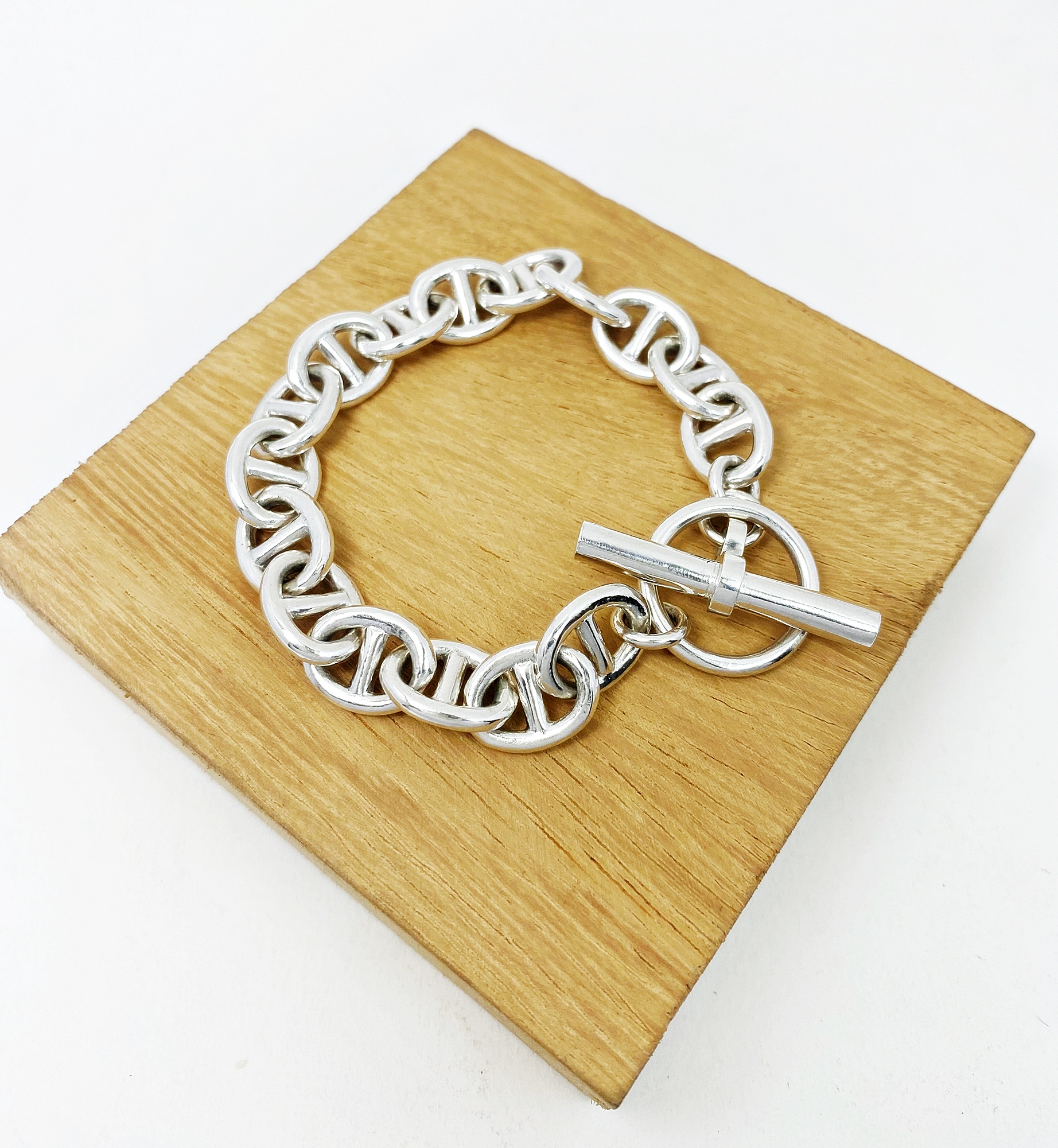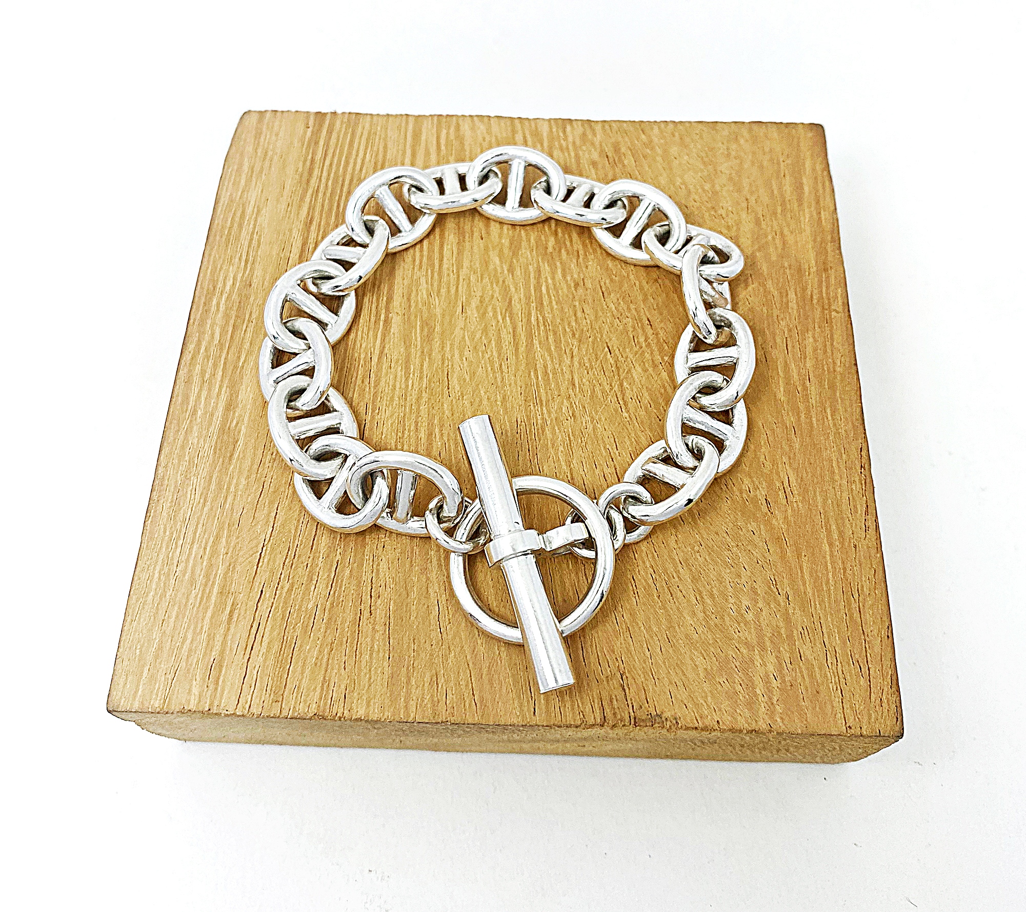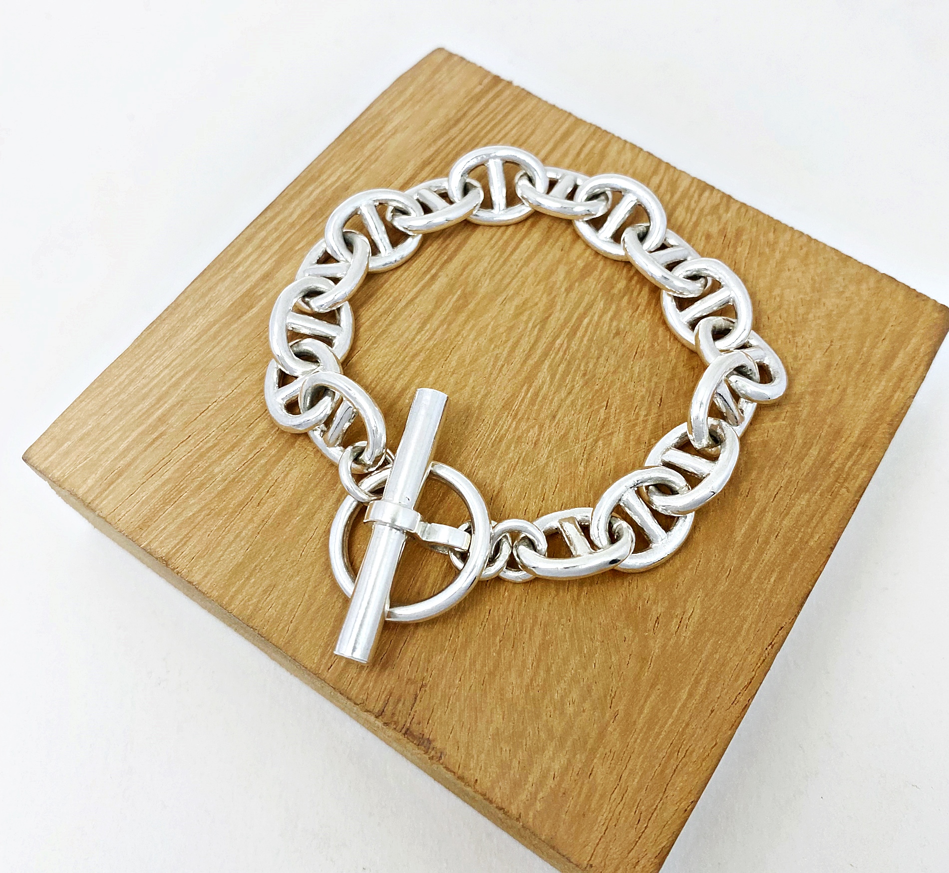 The chunky figure 8 link toggle bracelet is 925 sterling silver with handmade t bar bracelet designed and made by Sup Silver.