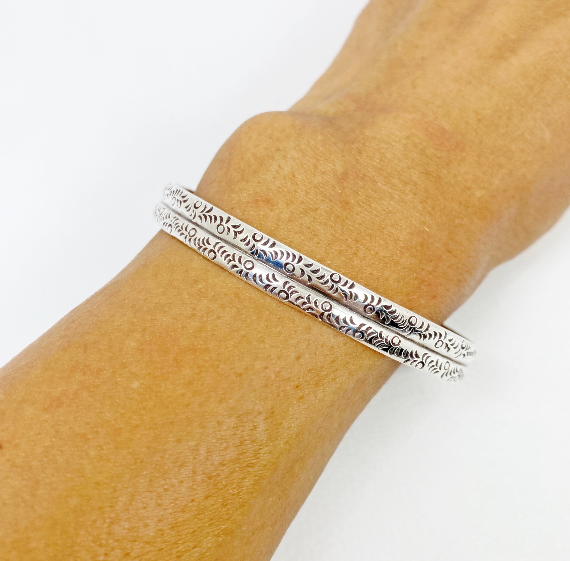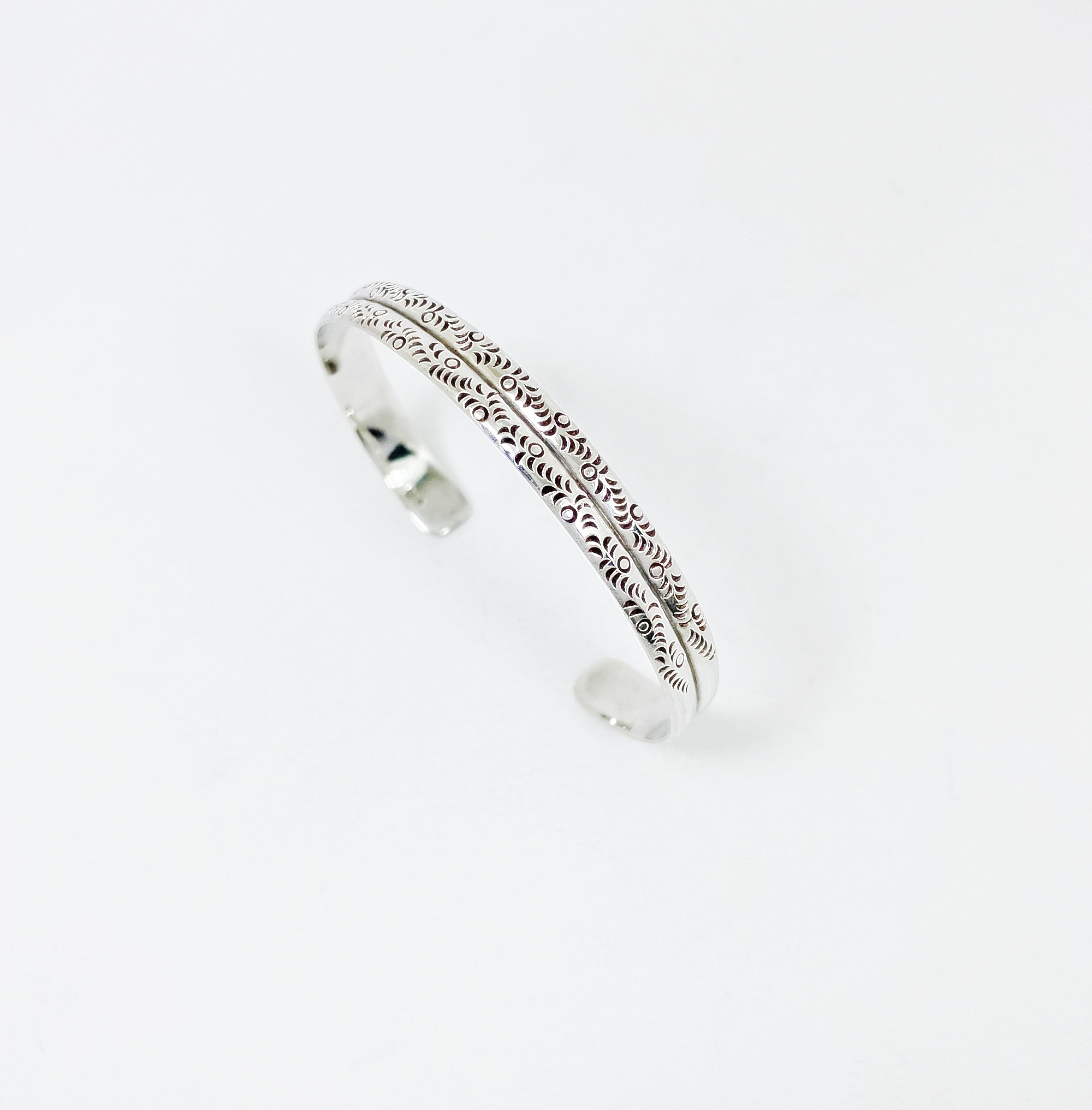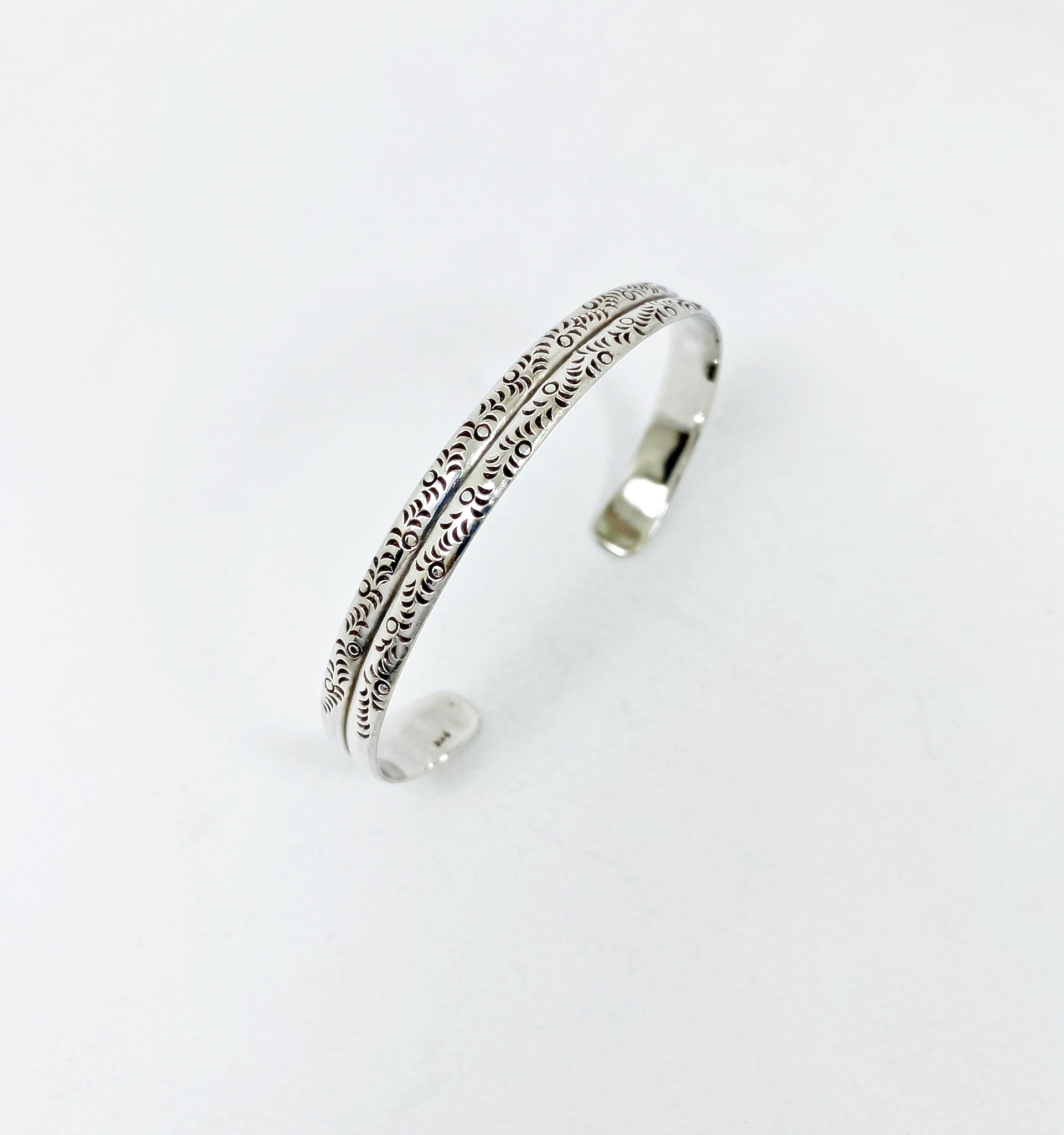The lovely flower textured cuff bangle is 925 sterling silver with handmade unisex two-layer bracelet designed and made by Sup Silver.