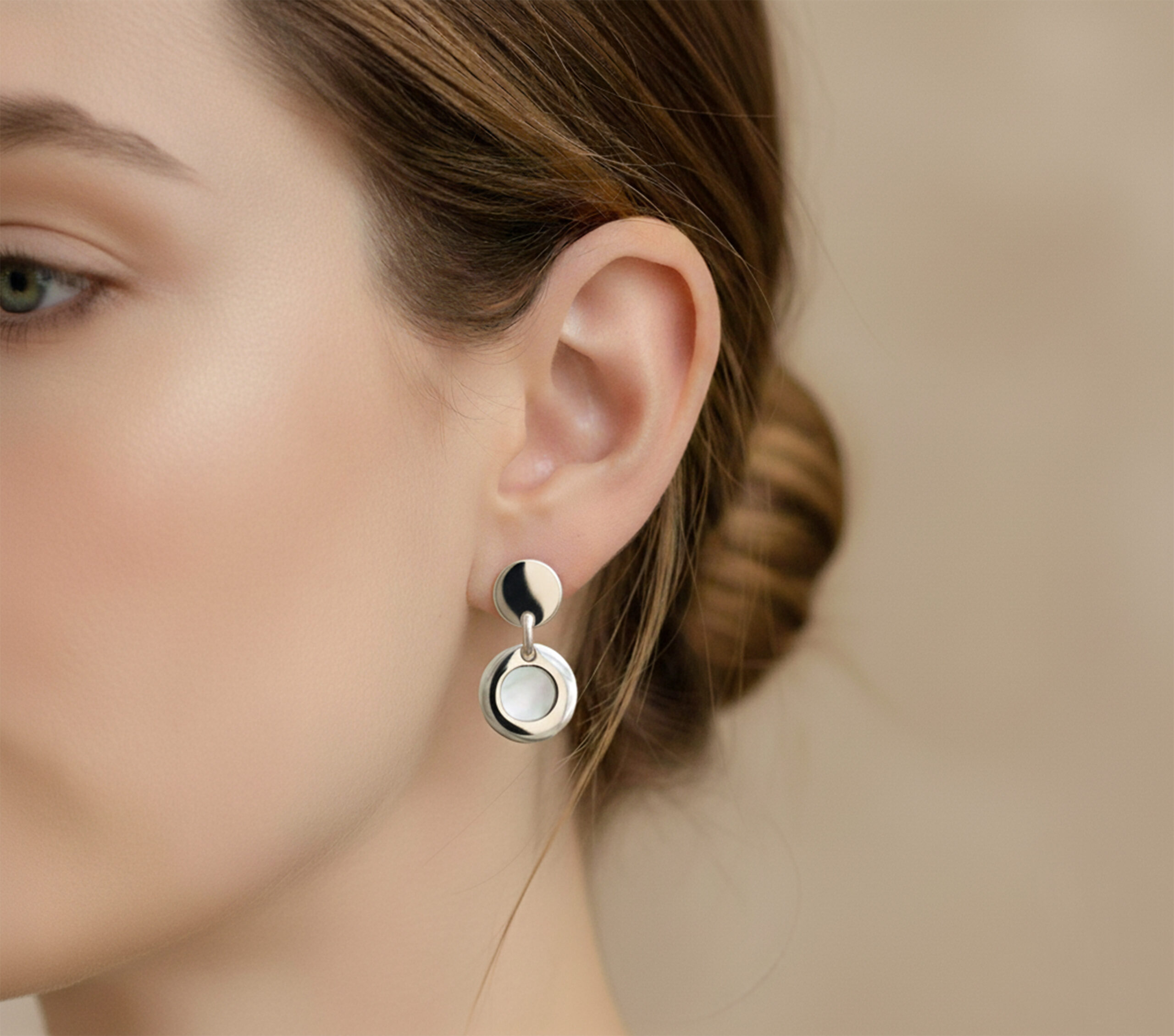 The modern white mother pearl double disc drop earrings are 925 sterling silver with handmade women studs designed and made by Sup Silver.